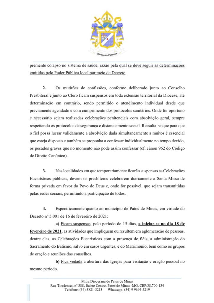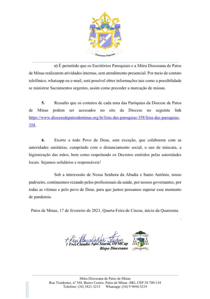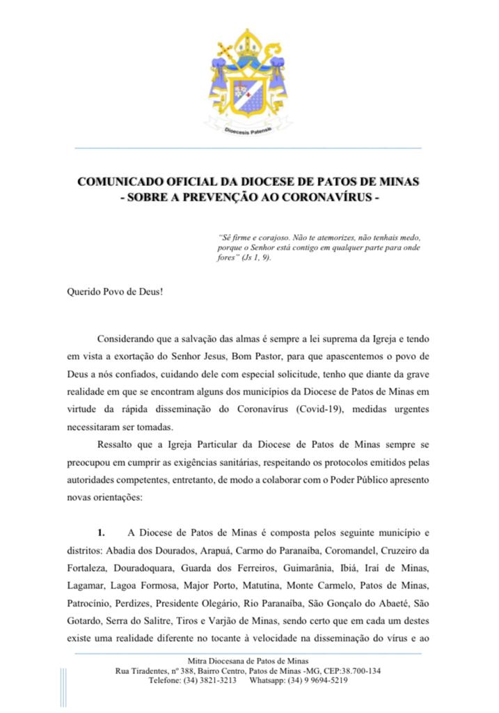 Nesta quarta-feira (17), a Diocese de Patos de Minas publicou um comunicado com novas orientações para restringir a proliferação do novo Coronavírus. A decisão foi tomada em virtude do alto número de casos em alguns municípios que compõe a Diocese.