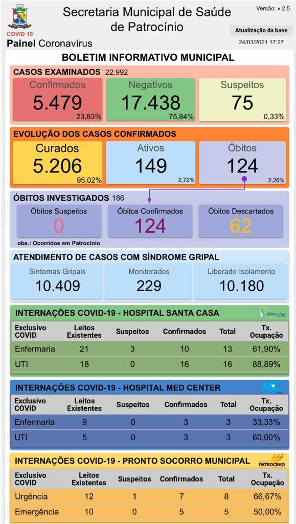 O novo boletim epidemiológico de coronavírus foi divulgado nesta quarta-feira (24) pela Secretaria Municipal de Saúde de Patrocínio.