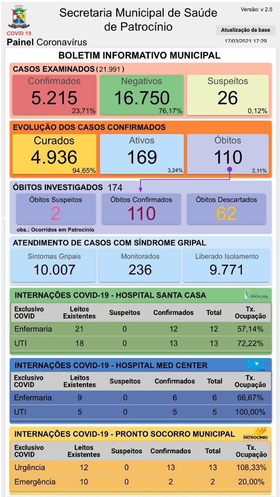 Foi divulgado nesta quarta-feira (17), pela Secretaria Municipal de Saúde de Patrocínio, o novo boletim epidemiológico de coronavírus no município.
