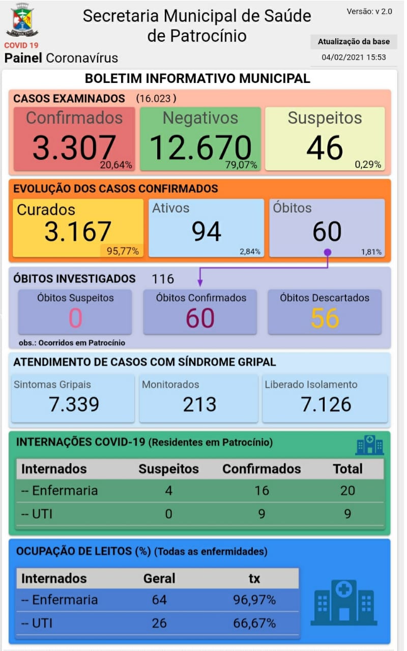 O novo boletim epidemiológico de coronavírus foi divulgado pela Secretaria Municipal de Saúde de Patrocínio na tarde desta quinta-feira (04).