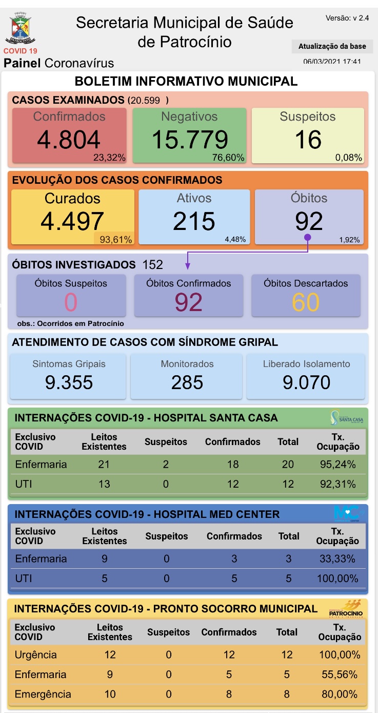 O novo boletim epidemiológico de coronavírus foi divulgado, na tarde deste sábado (06), pela Secretaria Municipal de Saúde de Patrocínio.