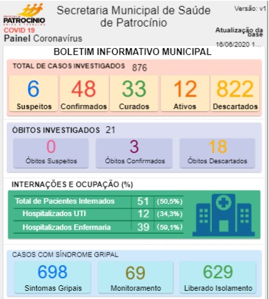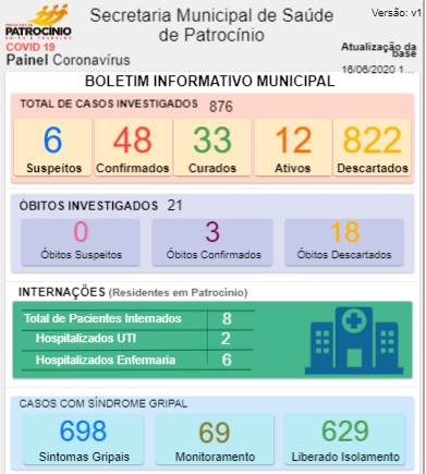 A Secretaria Municipal de Saúde de Patrocínio divulgou, na manhã desta terça-feira (16), novo boletim epidemiológico sobre os casos de coronavírus no município e além do aumento de casos, novas informações foram acrescentadas, como a situação de internação hospitalar no município .