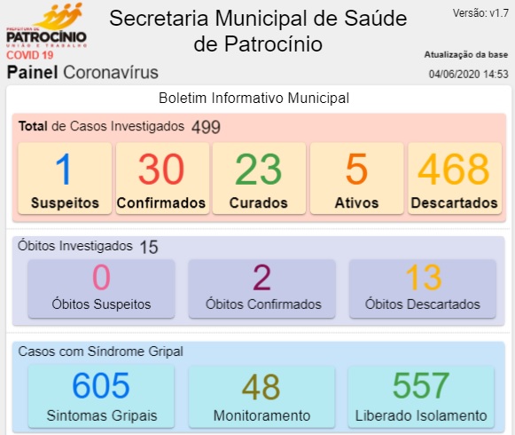 A Secretaria Municipal de Saúde de Patrocínio publicou, na tarde desta quinta-feira (04), a atualização do boletim epidemiológico do coronavírus.