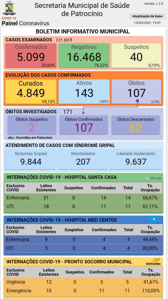 Foi divulgado nesta segunda-feira (15), pela Secretaria Municipal de Saúde de Patrocínio, o novo boletim epidemiológico de coronavírus no município.