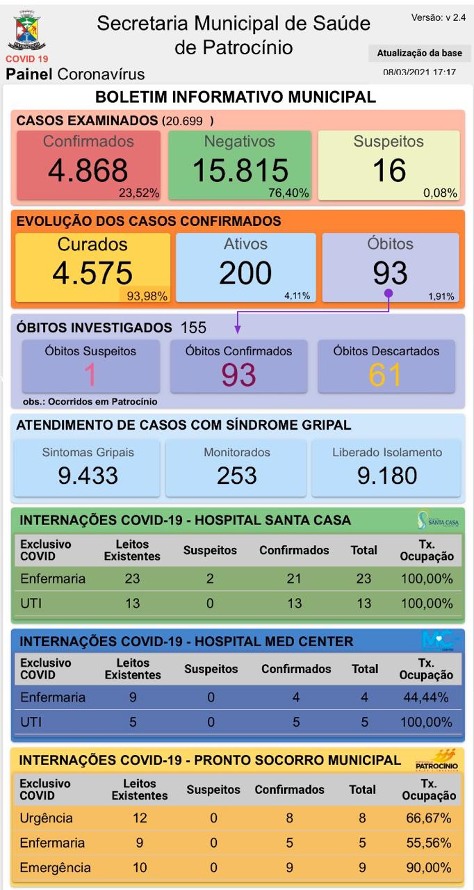 O novo boletim epidemiológico de coronavírus foi divulgado, na tarde desta segunda-feira (08), pela Secretaria Municipal de Saúde de Patrocínio.