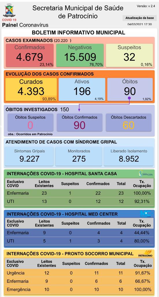 O novo boletim epidemiológico de coronavírus foi divulgado, na tarde desta quinta-feira (04), pela Secretaria Municipal de Saúde de Patrocínio.