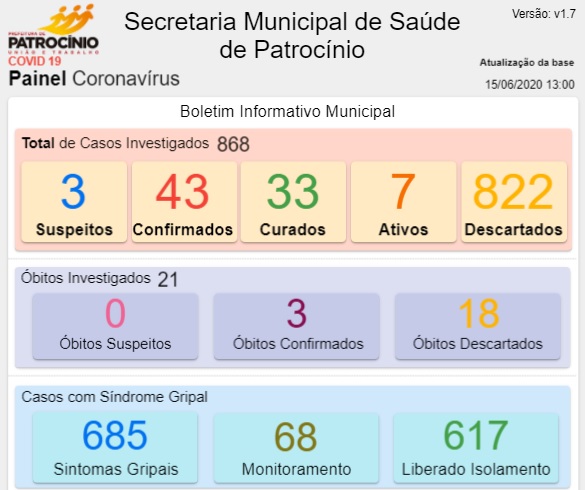 A Secretaria Municipal de Saúde de Patrocínio divulgou, na tarde desta segunda-feira (15), novo boletim epidemiológico sobre os casos de coronavírus no município .