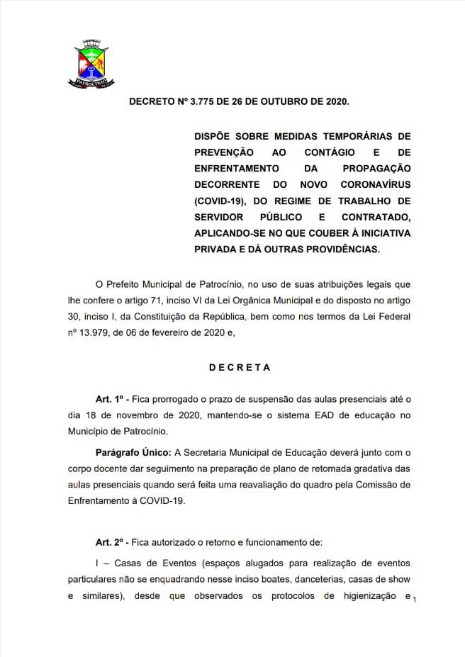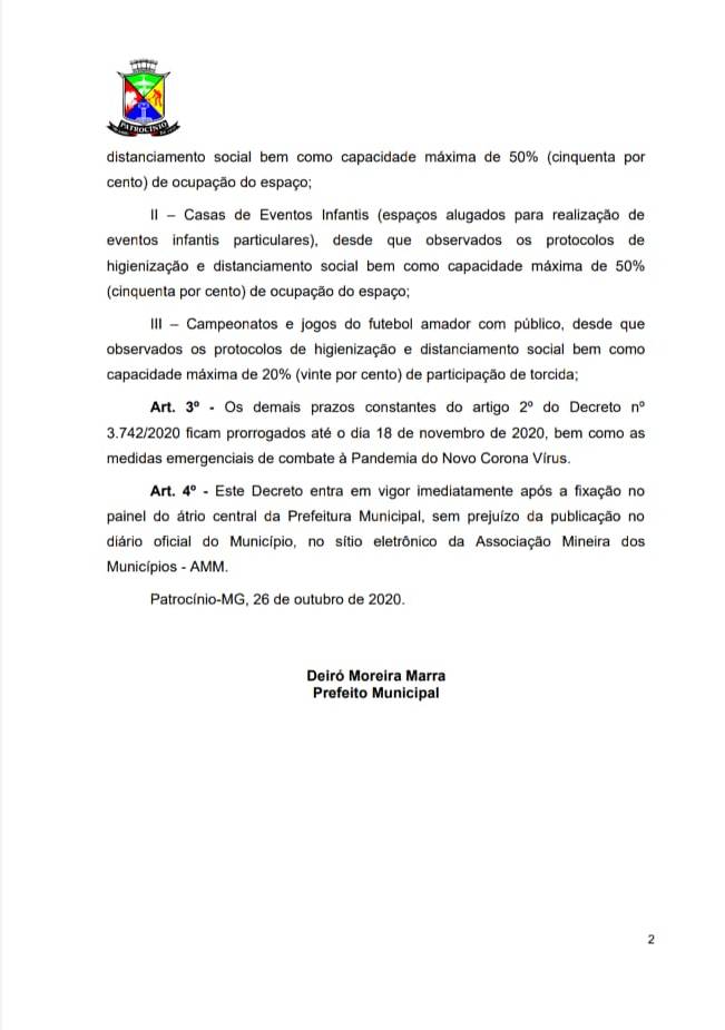 O prefeito de Patrocínio publicou, na tarde desta segunda-feira (26), o novo decreto municipal de n° 3.775 que trata sobre as medidas de prevenção e contágio da Covid-19.