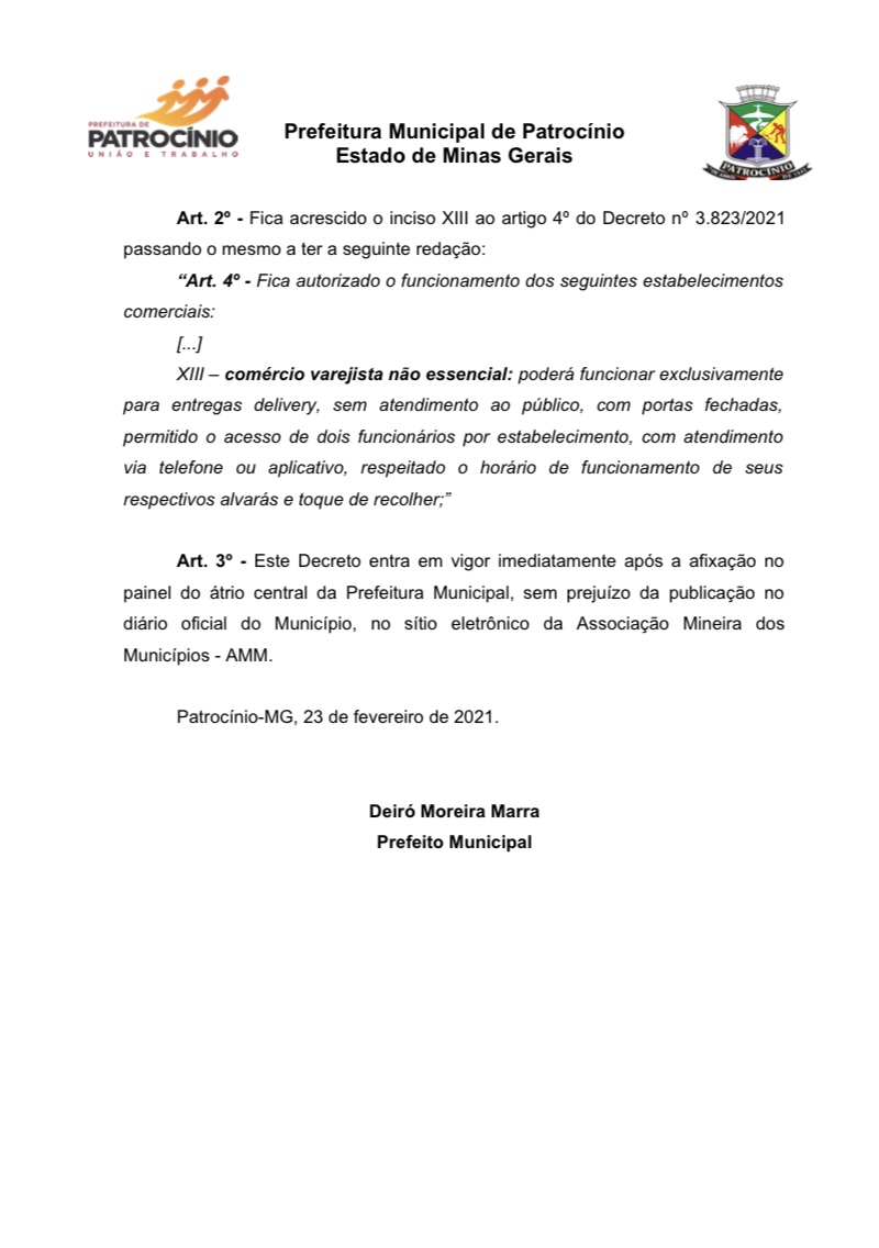Na tarde desta terça-feira (23), a Prefeitura de Patrocínio publicou um novo decreto que autoriza o funcionamento do comércio varejista em geral por meio de delivery.