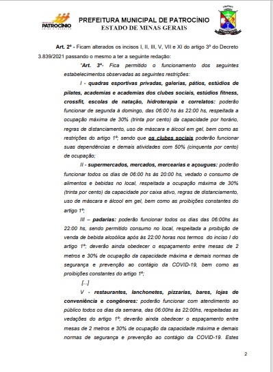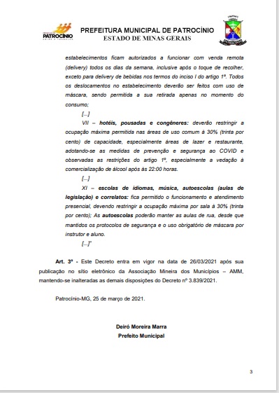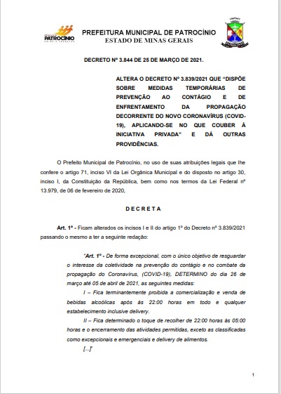 A administração pública de Patrocínio divulgou nesta quinta-feira (25) o novo decreto municipal, de n° 3.844 de 25 de março de 2021, que altera algumas medidas impostas pelo decreto anterior de n° 3.839 de prevenção à Covid-19.