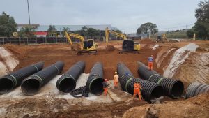 Foram 86 tubos colocados na última semana, a primeira caixa está em andamento onde está sendo feito o saqueamento da mesma, logo será iniciada a outra perna levando também na Afonso Pena onde também tem uma caixa e assim se dará sequência até chegar ao Catiguá.