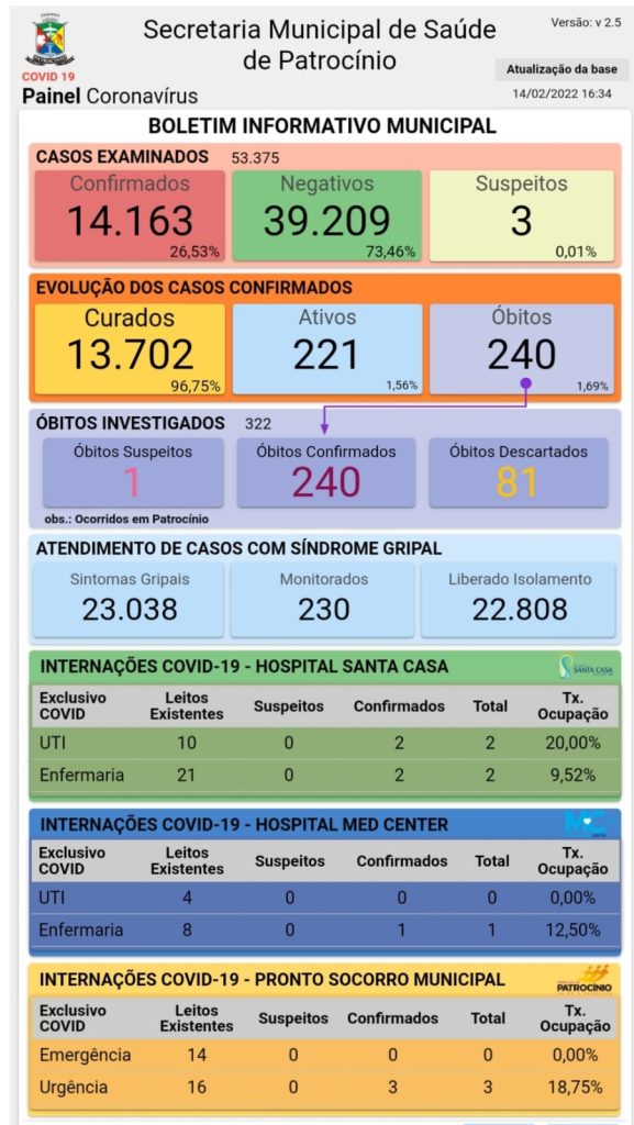 Nesta segunda-feira (14) a Secretaria Municipal de Saúde de Patrocínio divulgou o novo boletim epidemiológico de coronavírus.