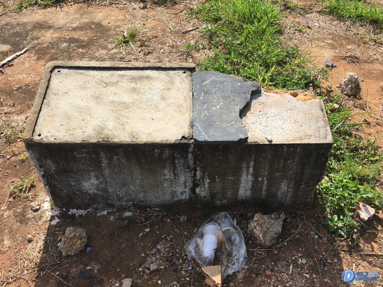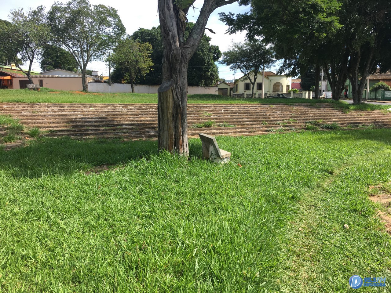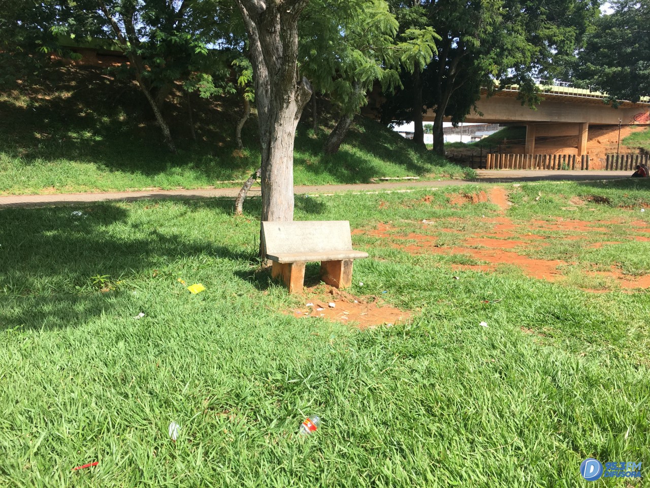 O gramado está dando lugar a braquiária e ervas daninha, em meio à vegetação é visível a presença de lixo, tais como: sacolas plásticas, embalagens de alimentos, garrafas quebradas, garrafas plásticas, dentre outros.