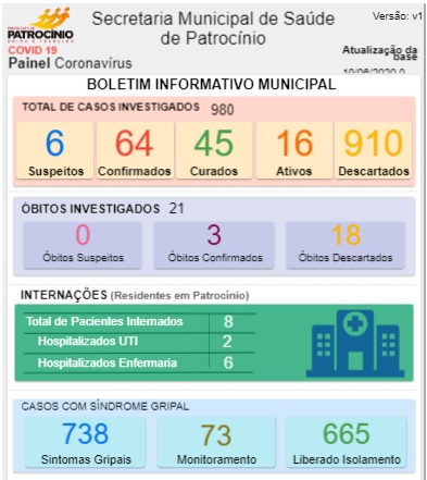 Novo boletim epidemiológico sobre os casos de coronavírus em Patrocínio foi divulgado pela Secretaria Municipal de Saúde, na manhã desta sexta-feira (19).