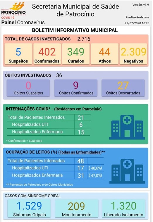 Patrocínio totaliza 402 pacientes infectados pelo vírus. Entre eles, 349 se recuperaram da doença, 44 ainda estão com o vírus ativo e nove foram a óbito.