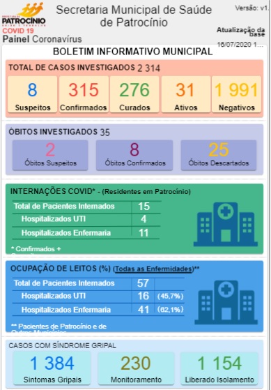 A Secretaria Municipal de Saúde de Patrocínio divulgou na manhã desta quinta-feira (16) o novo boletim epidemiológico de coronavírus.