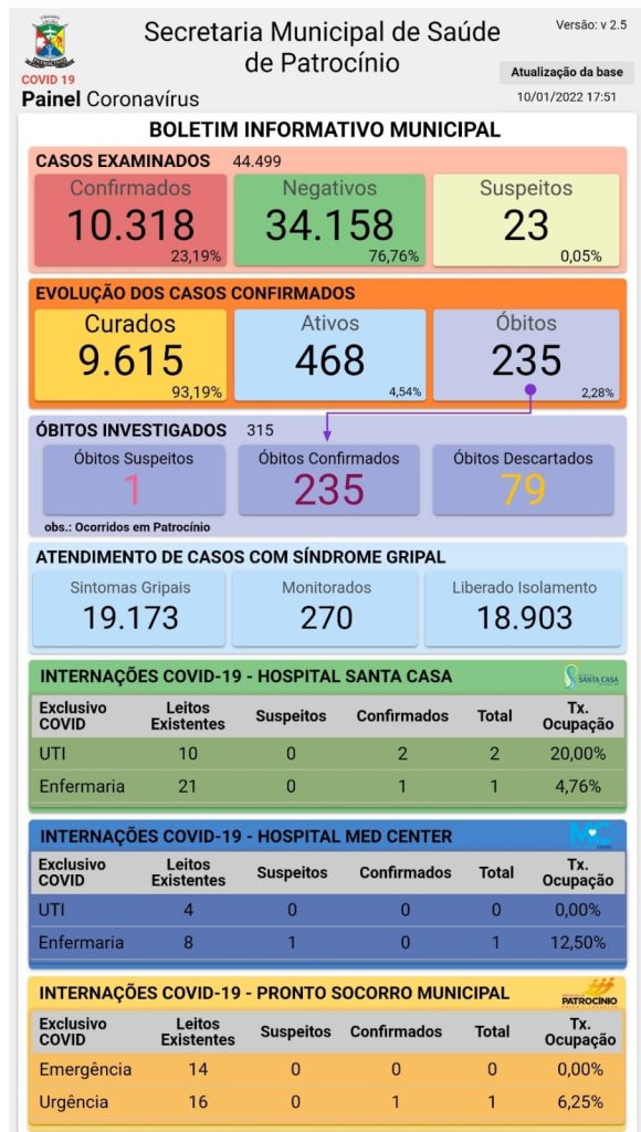 A Secretaria Municipal de Saúde de Patrocínio divulgou nesta segunda-feira (10) o novo boletim epidemiológico de coronavírus.