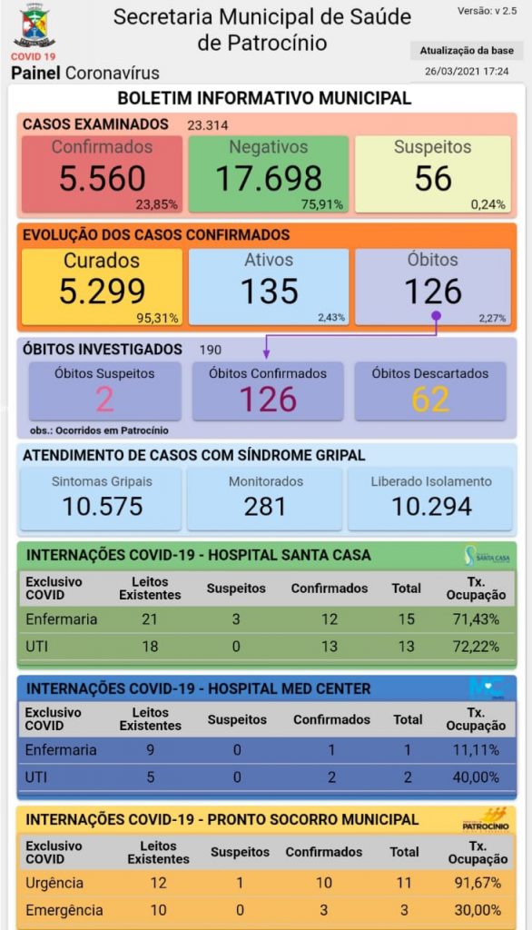 O novo boletim epidemiológico de coronavírus foi divulgado pela Secretaria Municipal de Saúde de Patrocínio na tarde desta sexta-feira (26).