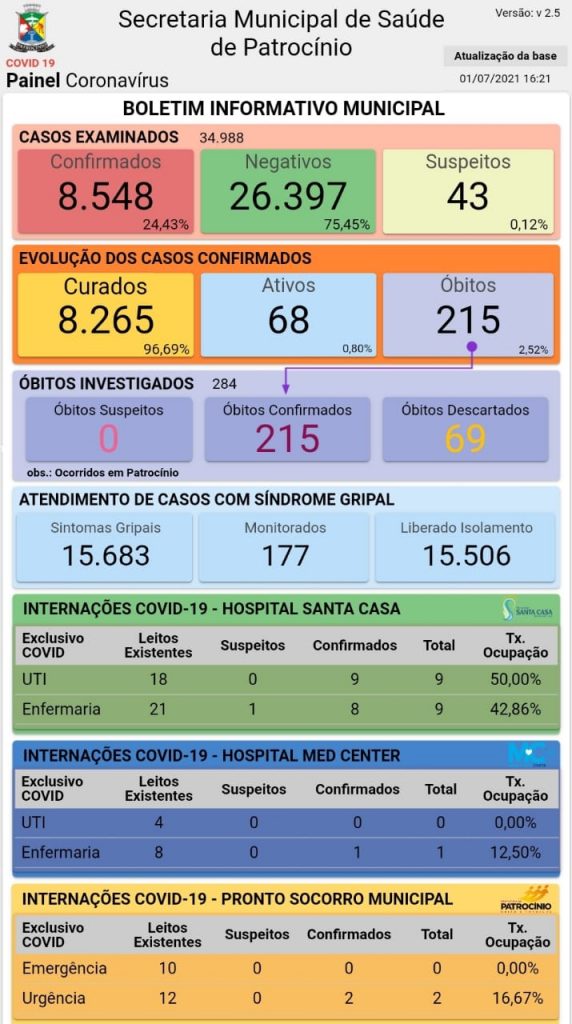 Nesta quinta-feira (1º), a Secretaria Municipal de Saúde de Patrocínio divulgou o novo boletim epidemiológico de coronavírus.