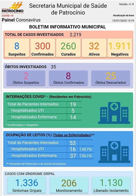 O novo boletim epidemiológico de coronavírus foi divulgado na tarde desta quarta-feira (15) pela Secretaria Municipal de Saúde de Patrocínio.