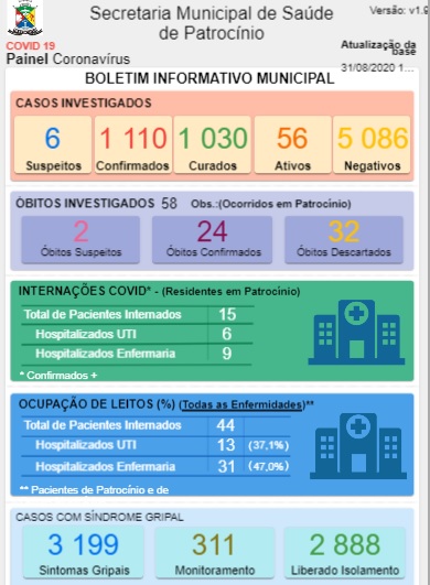 A Secretaria Municipal de Saúde de Patrocínio divulgou o novo boletim epidemiológico de coronavírus nesta segunda-feira (31).
