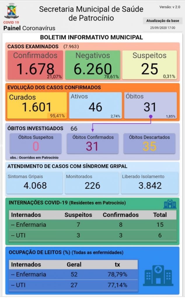 Patrocínio totaliza 1.678 casos confirmados de coronavírus, dentre os quais 1.601 curados, 46 com o vírus ativo e 31 óbitos.