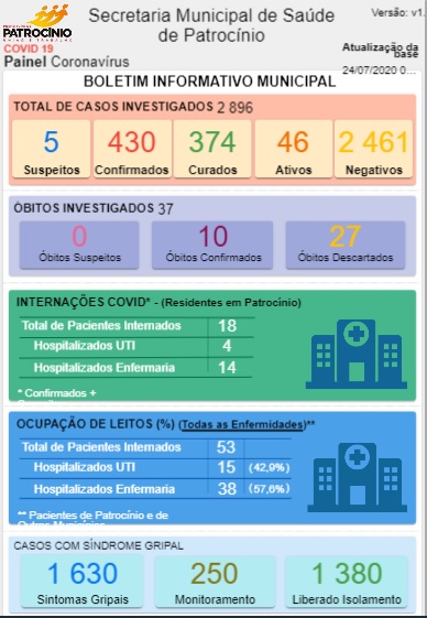 O novo boletim epidemiológico de coronavírus foi divulgado pela Secretaria Municipal de Saúde de Patrocínio na manhã desta sexta-feira (24).