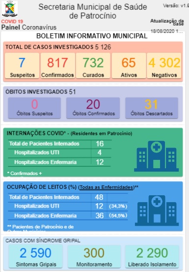Os casos confirmados de Covid-19 em Patrocínio chegam a 817, dos quais 732 estão curados, 65 com o vírus ativo e 20 óbitos.