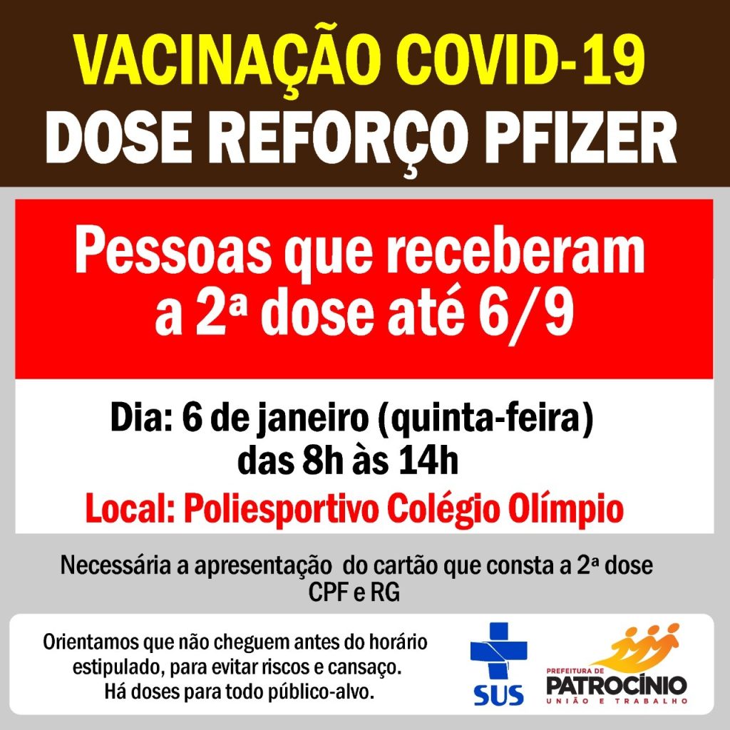 Nesta quinta-feira (06) pessoas que receberam a 2ª dose até o dia 06 de setembro receberão a dose de reforço.