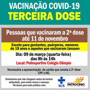 Pessoas que vacinaram a segunda dose contra Covid-19 até o dia 11 de novembro, recebem a terceira dose nesta quarta-feira, dia 09 de março. Esta etapa é exceto para gestantes, puérperas, menores de 18 anos e aqueles que vacinaram Janssen.