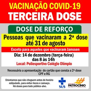 A vacinação ocorrerá no poliesportivo do Colégio Municipal Professor Olímpio dos Santos, das 08h às 14h. Vale lembrar que é necessária a apresentação do cartão que consta a segunda dose, CPF e RG.