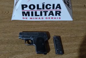 Durante buscas no imóvel foi localizada em cima do um guarda roupas, uma pistola calibre 7.65 mm.