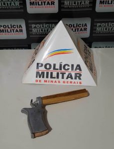 Durante verificação, os militares localizaram uma réplica caseira de arma e confirmaram que havia um Mandado de Prisão em desfavor do autor.