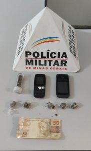 Durante busca foram localizados e apreendidos, cinco buchas de maconha, um frasco de semente de maconha, dois telefones celulares e R$ 50,00.