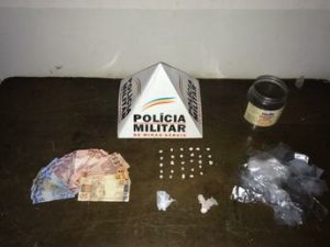 Durante busca pessoal foi localizada com o autor a quantia de R$ 32,00 reais em seu bolso. Na residência, foi localizado um pote contendo em seu interior diversas embalagens de refresco comumente utilizadas na dolagem das drogas, a quantia de R$290,00 reais, um tablete de substância semelhante à maconha, que se fracionadas renderiam, aproximadamente, 10 buchas, 28 pedras de substância semelhante a crack e uma porção semelhante a ácido bórico.