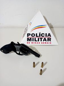 Durante a busca pessoal no abordado, foi localizado um Revolver Taurus na cor preta, calibre 38 municiado com 03 munições intactas prontas para uso.
