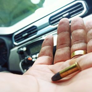 Após abordagem foi feita a busca pessoal e veicular, sendo localizado no automóvel em epígrafe uma munição calibre .22, a qual o autor informou ser de sua propriedade, porém negou possuir arma de fogo.