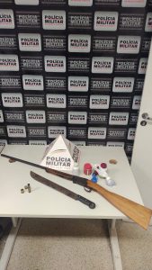Durante buscas na residência, foram localizados e apreendidos uma arma de fogo do tipo espingarda calibre 28 e vários objetos para fabricação de munição.