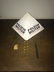Durante as buscas pelo local foram encontradas nove (09) pedras de substância semelhante a crack, já fracionadas para serem comercializadas, uma (01) pedra grande de substância semelhante a crack, a qual se fracionada, poderia render aproximadamente cem (100) pedras. Uma (01) faca de mesa, com resquícios de crack; duas (02) aparelhos de celular.