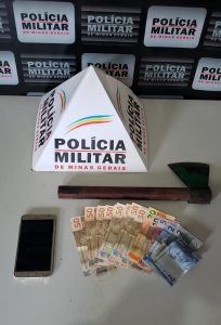 Foram apreendidos 01 veículo, 01 Machado, R$493,00 reais e 01 Celular.