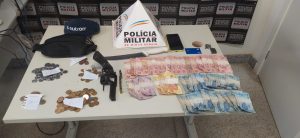 Diante das informações, os militares realizaram rastreamentos, localizaram e prenderam os autores e com eles, foram apreendidos um revólver cal. 38 carregado, sete munições cal. 38, um telefone celular e R$ 379.45 reais.
