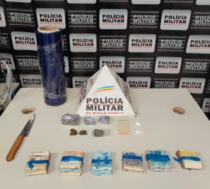 No local encontraram e apreenderam seis tabletes de maconha de tamanhos variados, dois comprimidos de ecstasy, dois dolas de cocaína e R$20.574,00 (vinte mil, quinhentos e setenta e quatro reais) em notas.