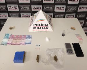 Diante da suspeição, os militares realizaram abordagem, prenderam dois indivíduos e apreenderam R$ 122,00 reais em notas. Além disso, foram apreendidos um tablete grande de maconha, um tablete pequeno de maconha, um invólucro contendo farelo de maconha, uma pedra bruta de escama, dois comprimidos de ecstasy, três adesivos NOH, uma balança de precisão cor prata, um aparelho celular e sacos plásticos para embalo do entorpecente.