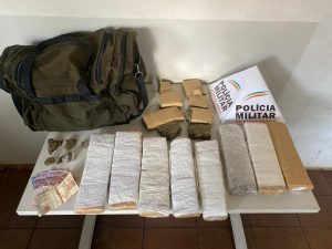 Após buscas, os militares localizaram e apreenderam: 08 barras de maconha; 08 tabletes grandes de maconha; 05 tabletes menores de maconha; R$132,00 em dinheiro; mala para transporte da drogas e um veículo Corsa Wind.