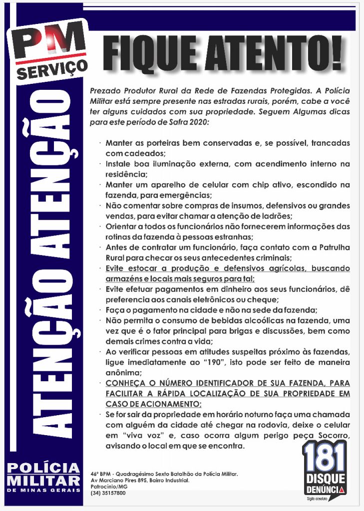 A Polícia Militar de Minas Gerais alerta aos produtores rurais para os riscos durante o período de safra e passa algumas orientações a serem seguidas em relação aos cuidados com a propriedade.