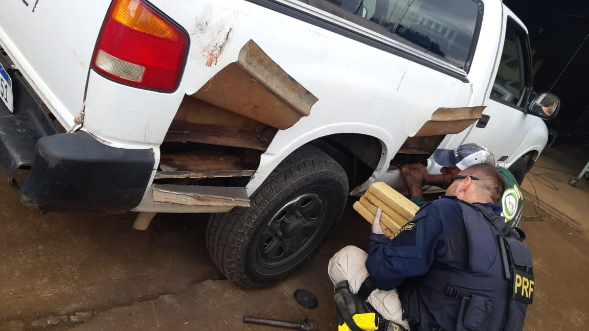 Diante do extremo nervosismo do condutor, foi feito uma fiscalização detalhada no veículo onde foram encontrados, em um fundo falso, 215 tabletes (aproximadamente 175 kg) de substância semelhante a maconha.