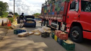 Ao fiscalizar o interior da carroceria, a qual estava com caixas de carregar hortifrutigranjeiros vazias, foi localizado em meio destas, mais de 800 tabletes de maconha, totalizando 833kg da droga.