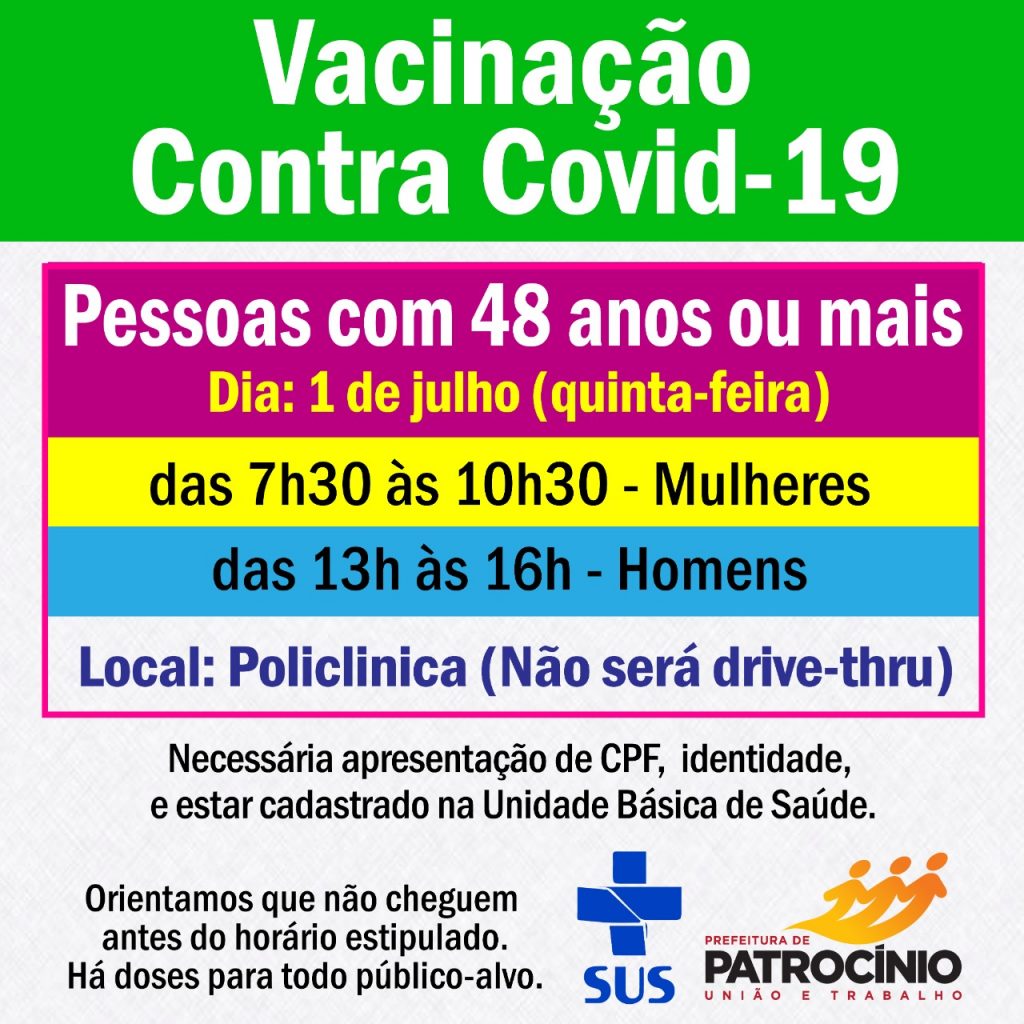 Nesta quinta-feira, dia 1º de julho, serão vacinadas as pessoas de 48 anos de idade.