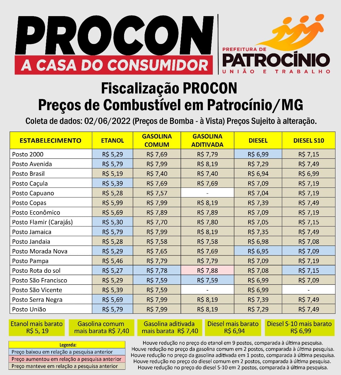 Rodrigo ainda destacou que o preço do etanol reduziu em nove postos . Houve redução no preço da gasolina comum em dois postos e da aditivada em um. Do diesel comum e diesel s10 redução em dois postos.