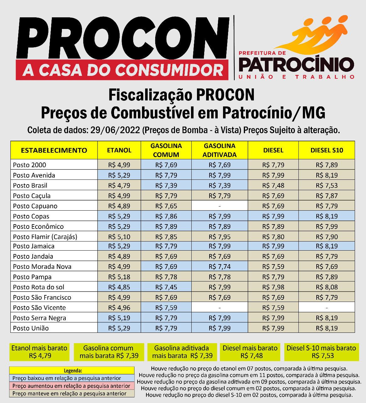 Na última quarta-feira (29), o Procon Municipal de Patrocínio divulgou mais uma pesquisa de preços de combustíveis vendidos nos postos do município.